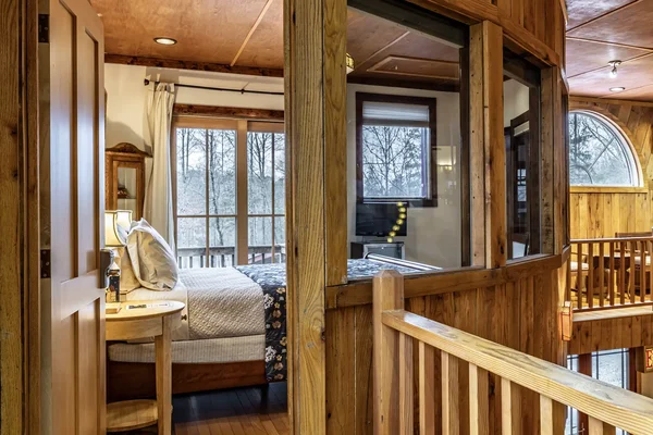 The Crow's Nest is a cozy suite in the Zen Barn. It features a queen-sized bed and an indoor balcony overlooking the Great Hall. Guests can enjoy fresh air on their private outdoor balcony. Shared bathrooms are available downstairs for convenience.