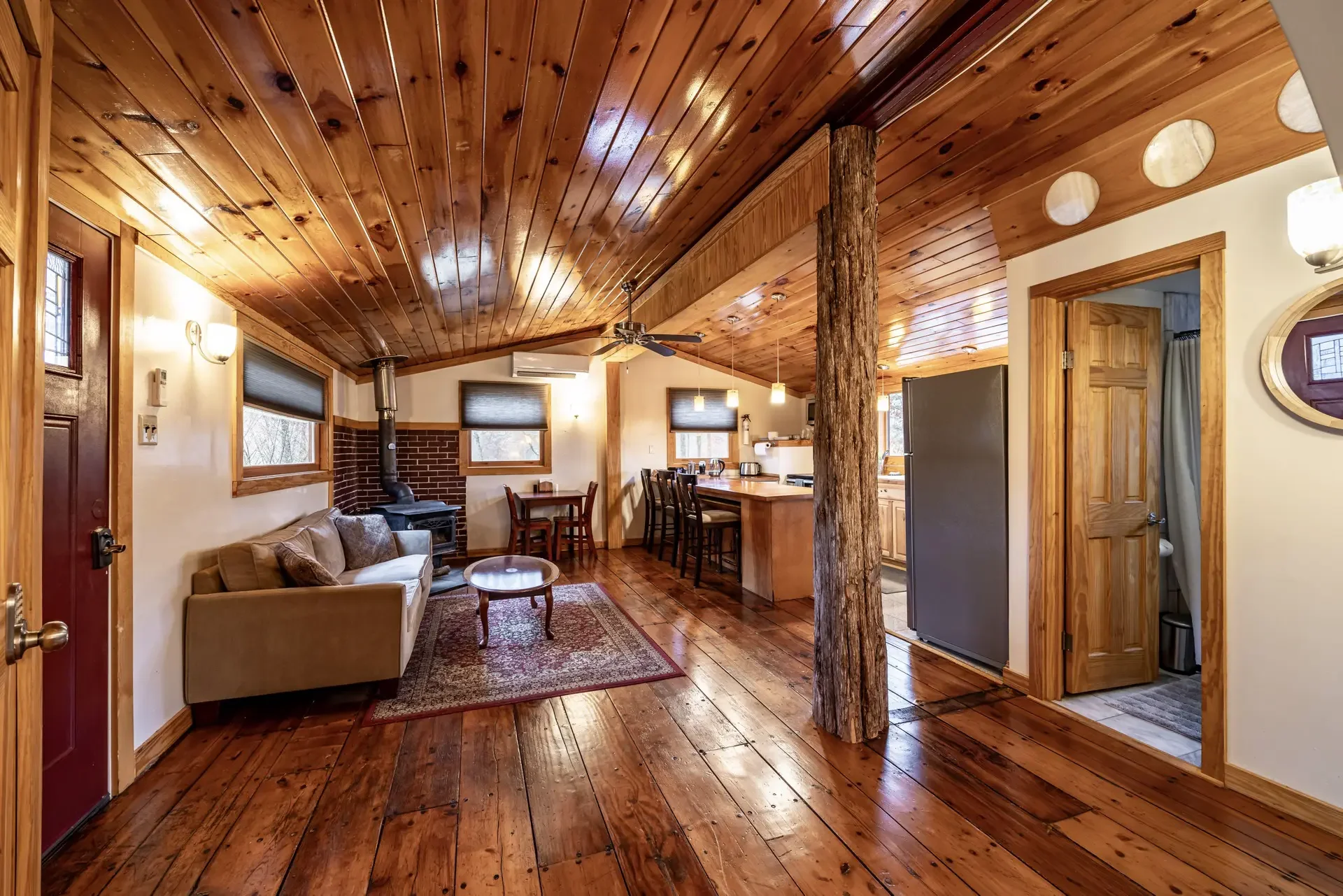A private, secluded getaway with rustic charm, featuring pinewood ceilings, a cozy wood stove, and scenic views of the surrounding farm and woods. Guests enjoy self check-in, a private entrance, and full access to the retreat’s amenities, including trails, a sauna, and a pond for fishing and canoeing. Located just a short drive from Stanardsville and Charlottesville, this peaceful cottage offers a perfect escape while staying close to dining and entertainment.